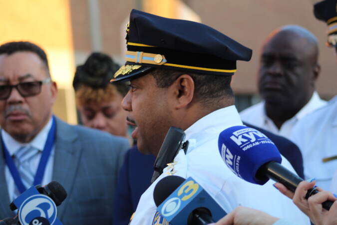 First Deputy Commissioner John Stanford addressed media at the scene of the shooting on Sep. 27, 2022. (Cory Sharber/WHYY)